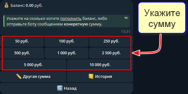 2. Укажите, на какую сумму хотите пополнить счет. Вы можете выбрать один из предложенных вариантов или отправить собственный боту сообщением.