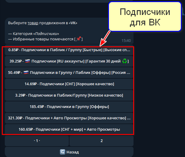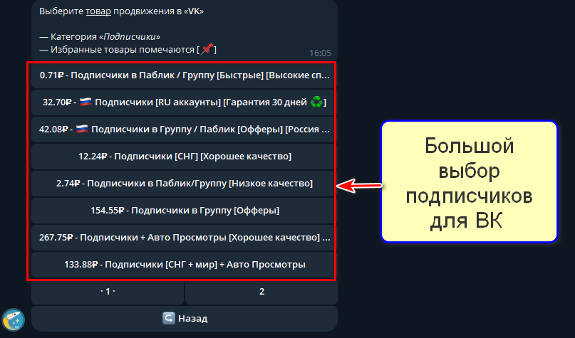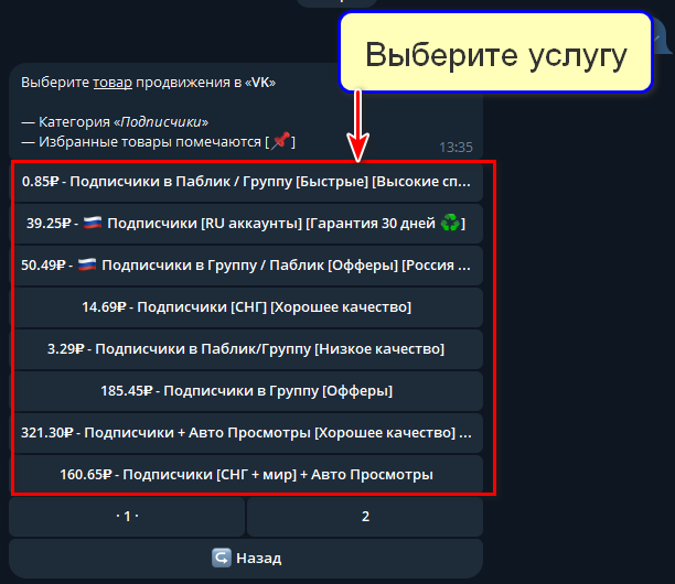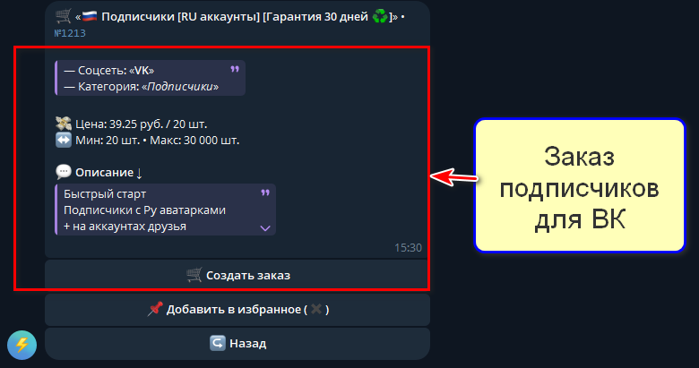 Для оформления заказа перейдите в Telegram-бот (ссылка на главной странице сайта). Он интуитивно понятен: сначала пополните баланс, затем выберите и закажите подписчиков для ВКонтакте.