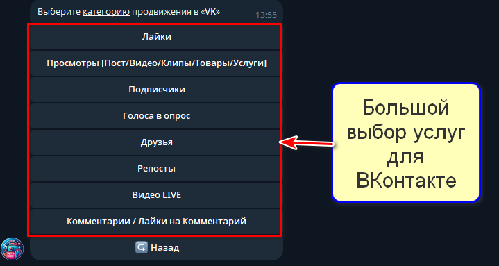 Бот с полным спектром SMM-услуг для соцсетей: лайки, просмотры, комментарии — пакетами или поштучно. Для продвижения ВКонтакте доступны подписчики и другие активности.