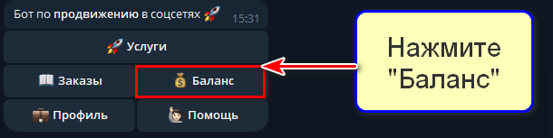 1. Найдите бот в Телеграме, запустите, в меню выберите кнопку «Баланс»: сначала нам нужно внести на него деньги, чтобы оплатить ими заказ.