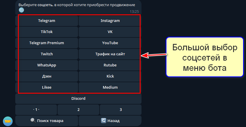 Бот поддерживает продвижение во многих других популярных соцсетях. Выгодные цены, функция «Избранное» для любимых услуг и заказ без регистрации.