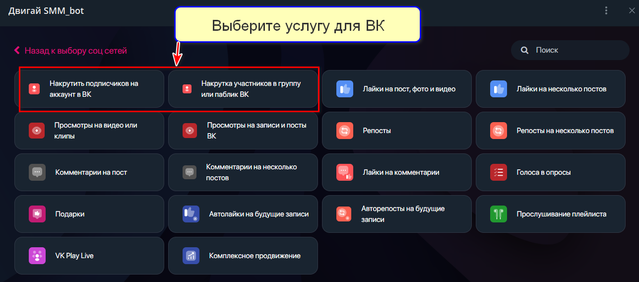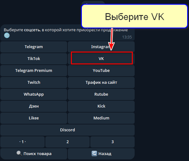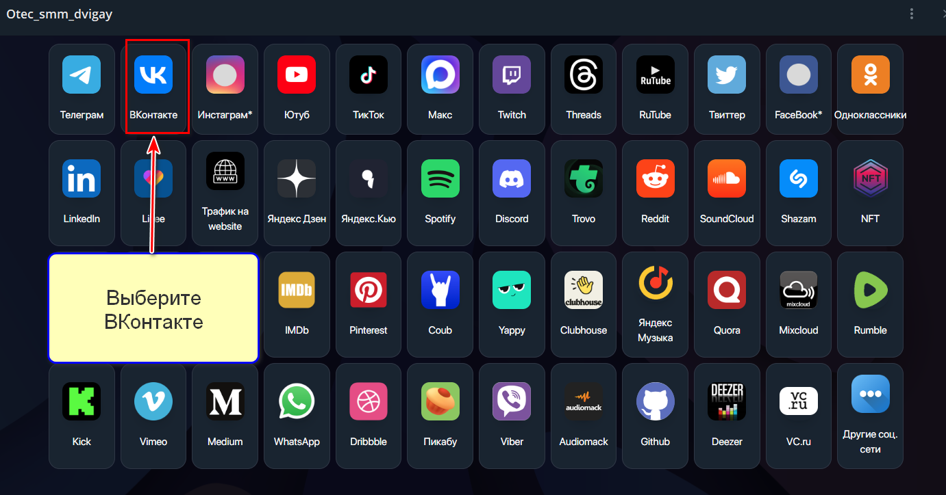 Telegram-бот для продвижения соцсетей, включая покупку подписчиков для ВКонтакте. Также доступны услуги для Одноклассников, Rutube и других платформ.