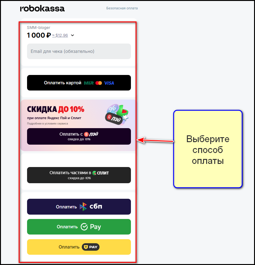 4. На экране появятся все возможные способы оплаты. Выберите подходящий и нажмите на него. Произойдет перенаправление на страницу оплаты. Следуйте инструкциям на ней для завершения платежа.