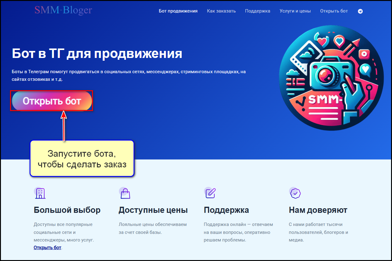 @SMM_Bloger_TOP_bot — удобный Telegram-бот с широким выбором услуг для соцсетей. Низкие цены, мгновенная обработка заказов, гарантия на услуги и круглосуточная техподдержка — всё для эффективного продвижения.
