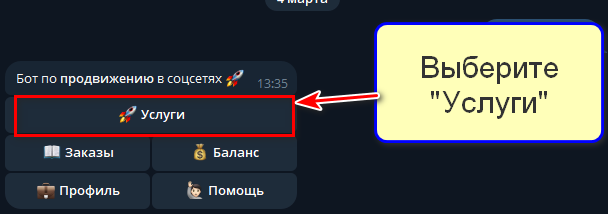 5. Вернитесь в меню и перейдите в раздел «Услуги», чтобы выбрать соцсеть и активность.