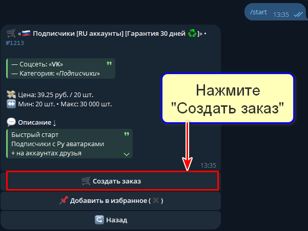 Оплатите заказ с баланса. В течение получаса он будет направлен в работу и через 3-4 часа выполнен, если вы не указали иное в его условиях. Отслеживать его статус вы сможете в меню бота, открыв раздел «Заказы».