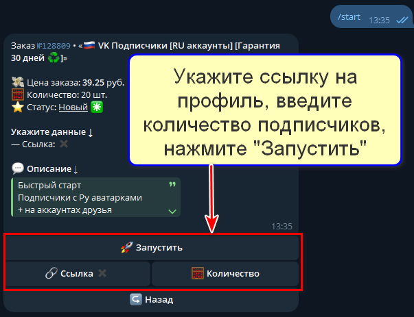 10. Укажите, сколько подписчиков хотите купить. Вставьте ссылку на профиль. Нажмите «Запустить».