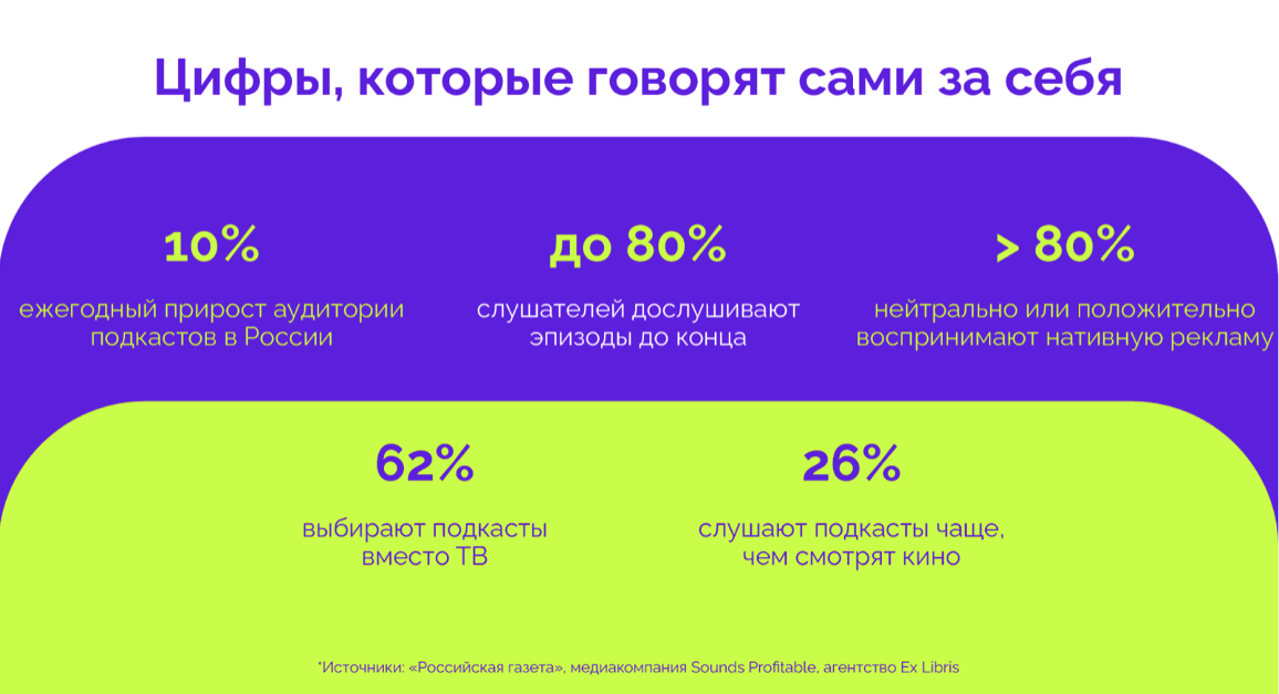 Подкасты — это не про разовый охват. Это про устойчивое присутствие, доверие и лояльность. Это канал, где бренд звучит как человек. И если делать это правильно — подкаст становится медиа с настоящим влиянием».