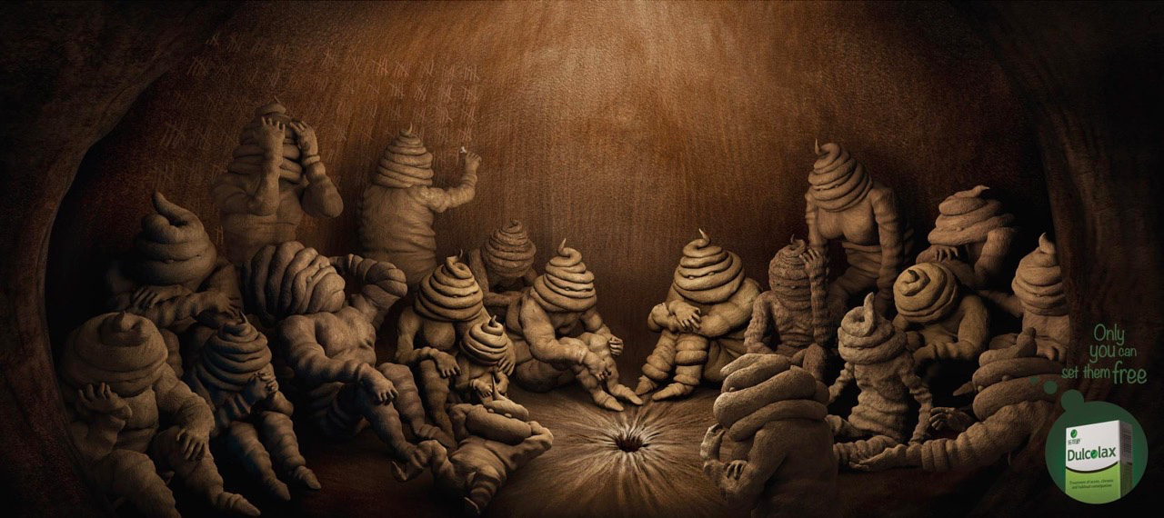 Но в поиске новых образов тоже легко перестараться: тогда реклама становится чересчур гротескной или нелепой — как ролик средства от грибка «Экзодерил», героями которого стали два человека с огромными ногтями вместо голов. Но, пожалуй, лидер по числу неудачных креативов среди заболеваний — проблема запоров. Вот так попытались изобразить эту проблему в рекламе «Фитомуцила»:
