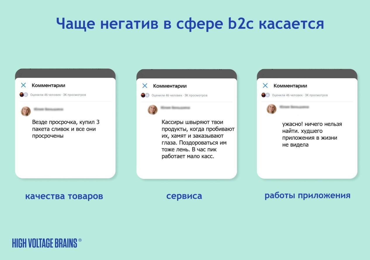 Качество сервиса: хамство сотрудников, медленная работа касс, длинные очереди в час пик. Подобные сообщения имеют высокую эмоциональную нагрузку и сильно влияют на восприятие бренда.