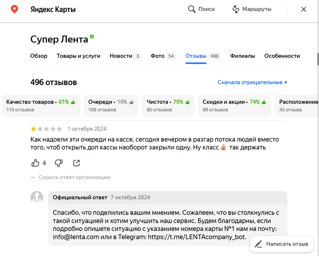 Реакция для «Ленты»: обязательно отвечать на каждый отзыв (и негативный, и позитивный). Ответ должен быть вежливым, персонализированным и содержать решение проблемы или благодарность. Это влияет на лояльность и решение новых клиентов.