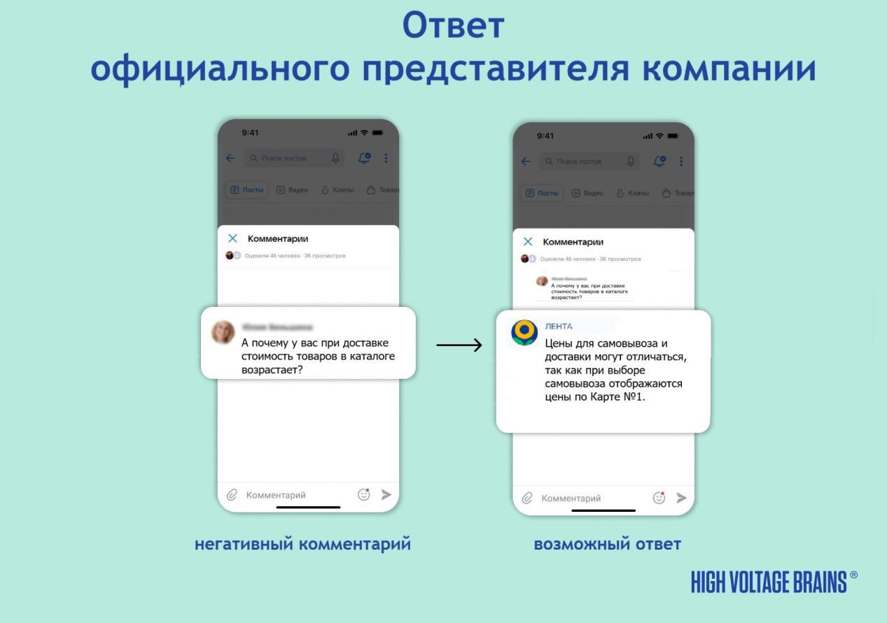 Реакция для «Ленты»: необходима оперативная публичная реакция с быстрым переводом диалога в личные сообщения или службу поддержки. Цель — продемонстрировать внимание к проблеме и её решение.