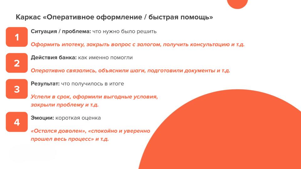 Собрать банк сценариев — не менее десятка жизненных ситуаций от консультации по ипотеке до решения спорного платежа. Каждый сценарий давал нам основу для уникального текста.