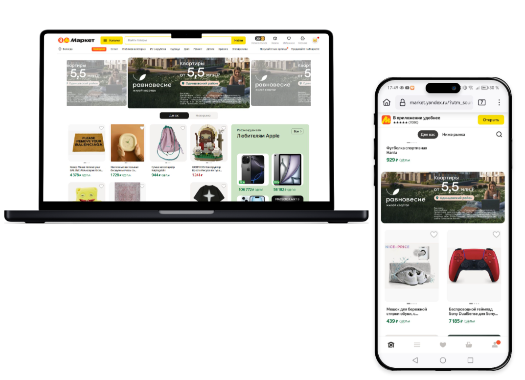 Для разных ЦА использовали единый креатив в нескольких форматах. Баннеры разместили на главной странице Маркета, а ещё в ленте товаров на сайте и в приложении. На этом этапе главной целью было выявить пользователей, которые показали самую большую вовлечённость и конверсию.