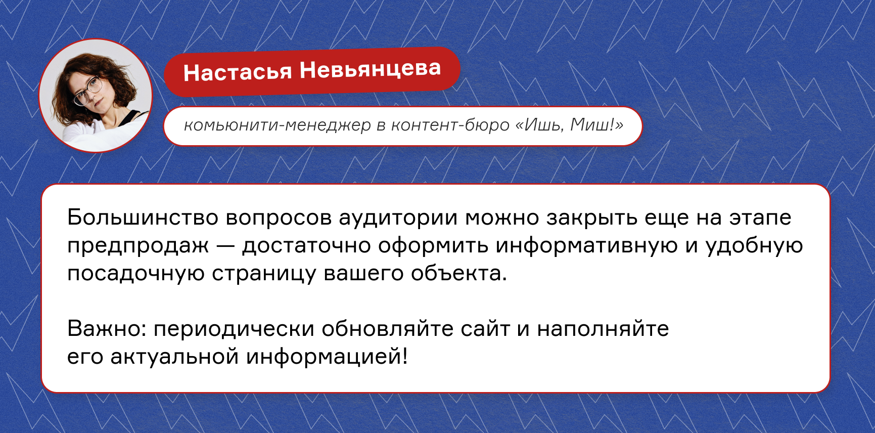 Совет: зачастую аудитория думает, что сдача дома и период выдачи ключей — это одно и то же, поэтому сразу после окончания стройки начинают пушить застройщика сообщениями. Здесь важно разложить всё по полочкам и обозначить текущий этап работ.