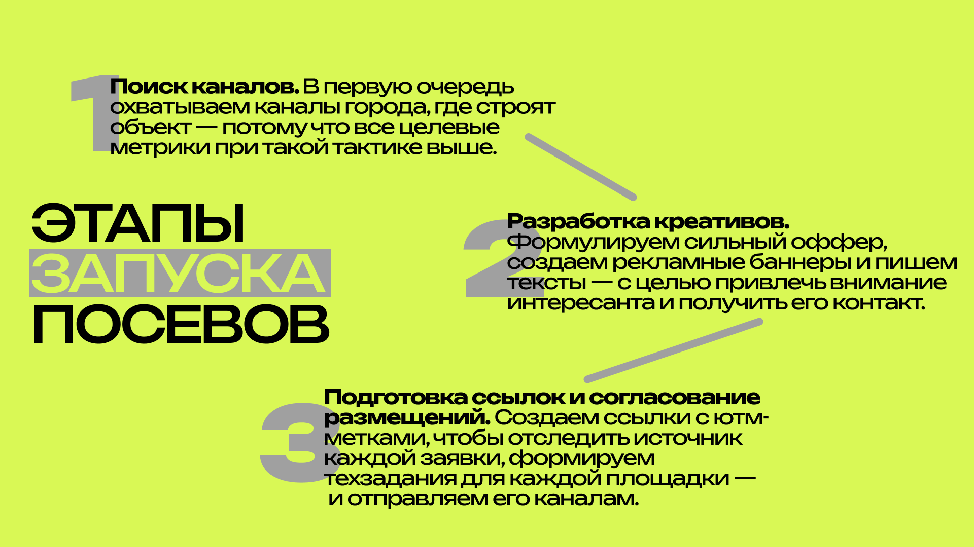 Сначала команда искала каналы именно города, где размещен объект. Если подходящих не хватало, подключали соседние регионы или те, откуда, по статистике, чаще всего приезжают покупатели.