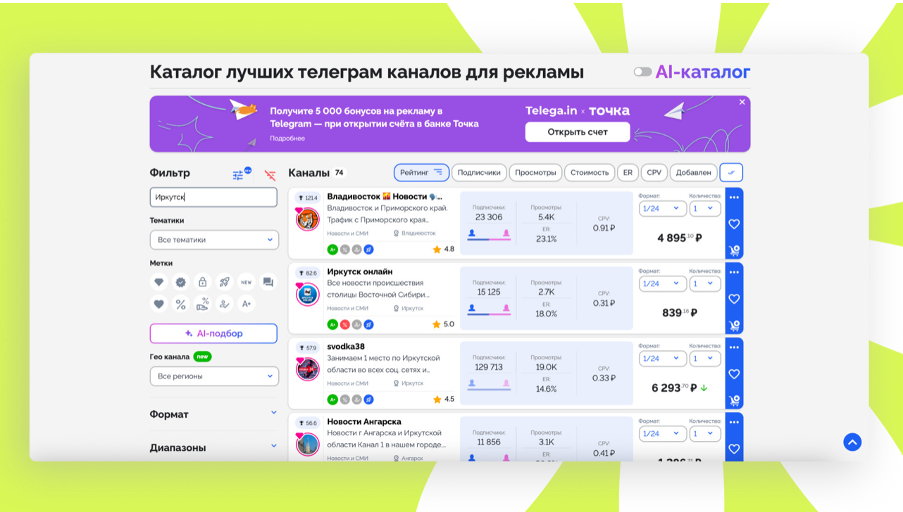 У Telega.in есть удобный инструмент для этого — поиск по региональным каналам. Он работает в двух вариантах: