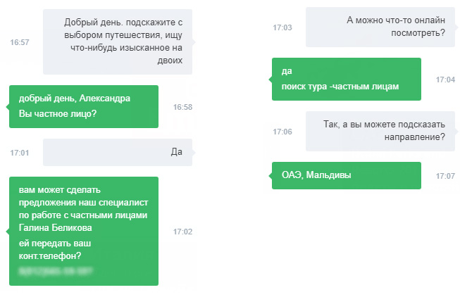 4. В следующей компании не пытаются выяснить даже минимум потребностей — сразу просят телефон. Возможно, это бот, но даже бота можно было бы «обучить» нескольким вопросам, чтобы предоставить менеджеру первичную информацию о клиенте. Так он смог бы позвонить с подготовленными турами, а не тратить время клиента при будущем разговоре.