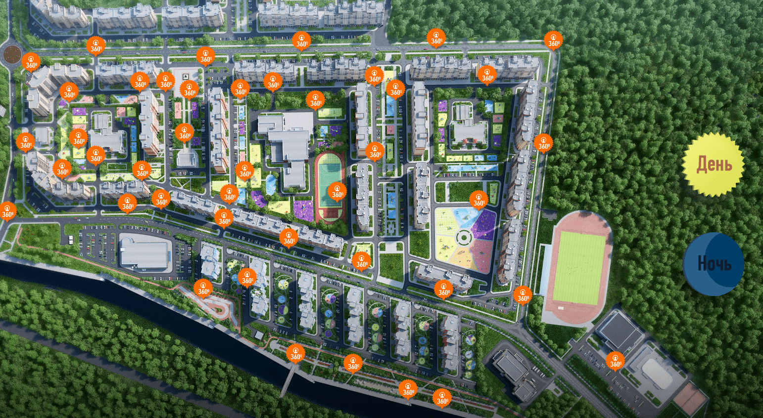 Виртуальный тур по 3D-модели ЖК на сайте lukinovarino.ru (застройщик «СУ-22»): высококачественная реализация с дополнительной возможностью переключения времени суток.