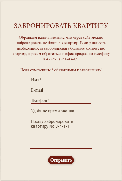Форма обратного звонка на сайте mk-borodino.ru (застройщик «Мастер-Ком»): простой и удобный функциональность без лишних деталей.