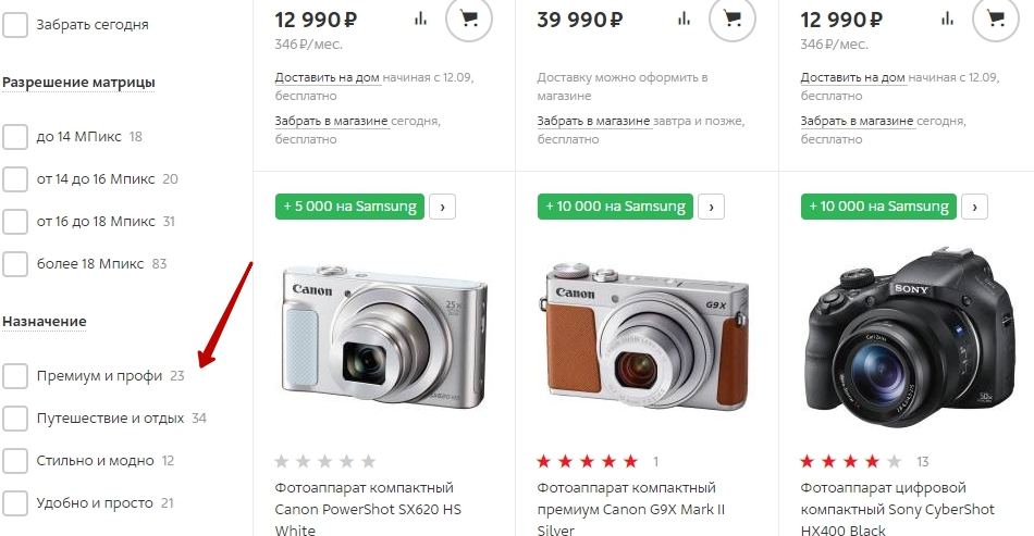 В первом случае можно создать категорию «Камеры для путешествий», во втором — «Фотоаппараты с матрицей CMOS». Те, кто интересуется профессиональной фототехникой, не будут отвлекаться на лишнюю информацию, а любителю станет проще подобрать камеру для своих целей. Велика вероятность, что по итогам теста увеличится как посещаемость сайта, так и конверсия в продажи.