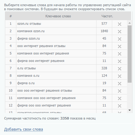 После добавления сайта сервис предложит список ключей. Лучше удалить собранные ключи и прописать только нужные запросы.
