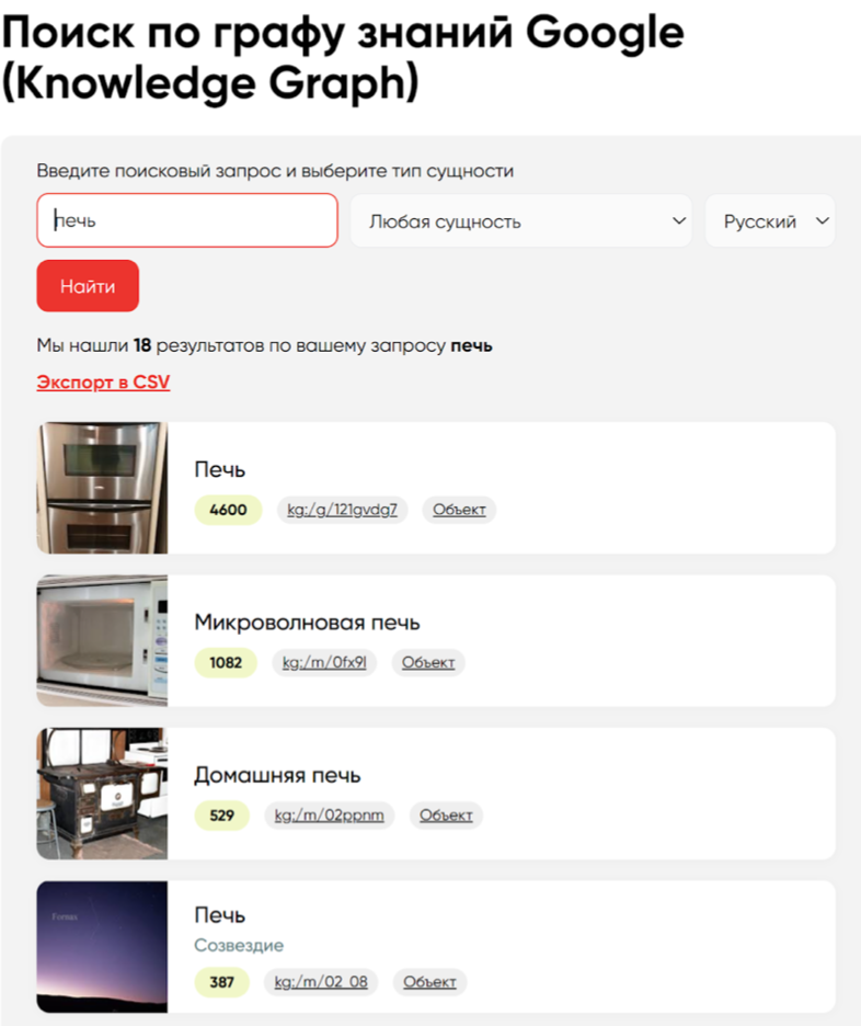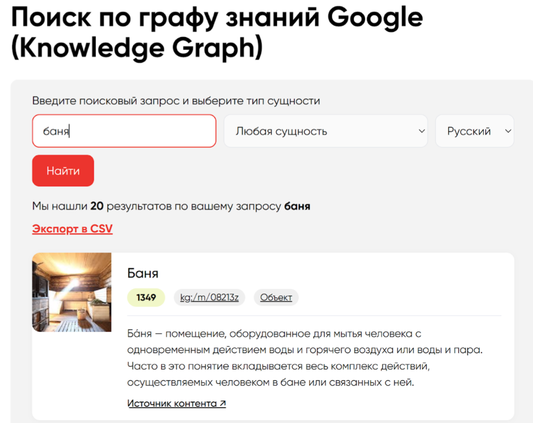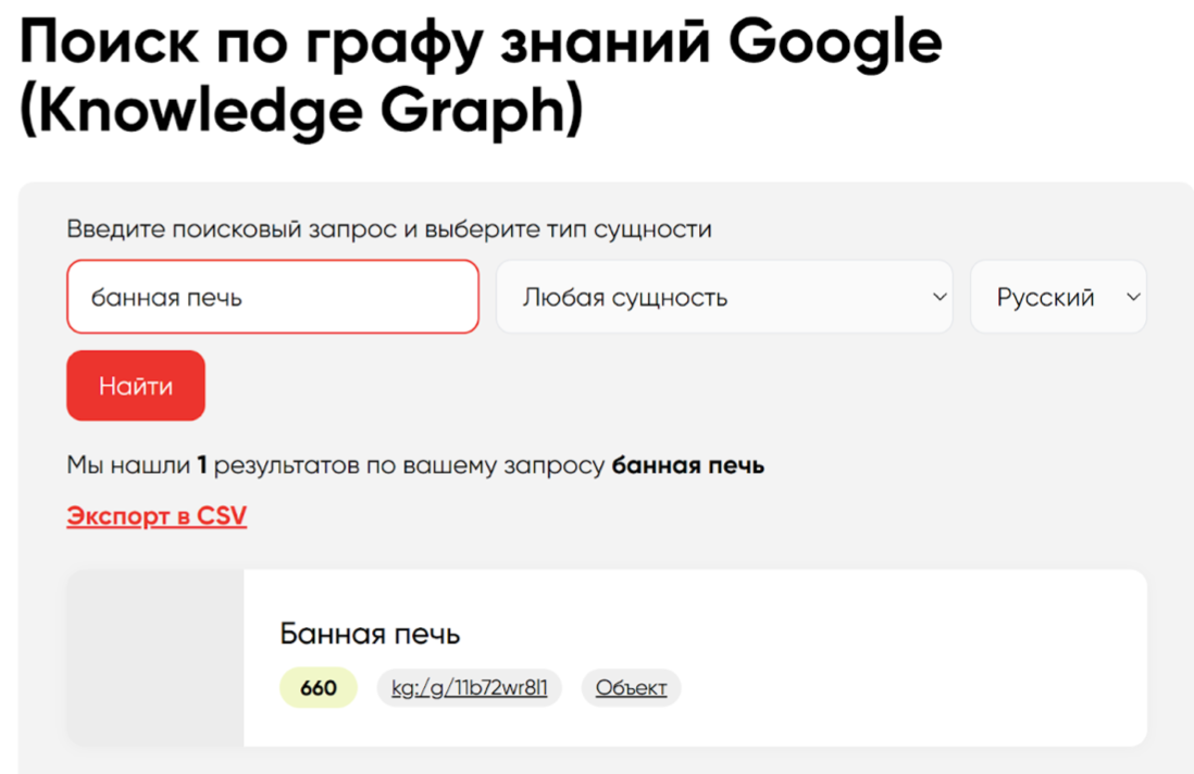 Поиск по графу знаний Google — веб-инструмент для поиска сущностей из Google Knowledge Graph. Находит уже известные Google объекты, смотреть их свойства и связи, экспортирует данные. Подходит для расширения семантического ядра, подбора синонимов и построения тематических кластеров.