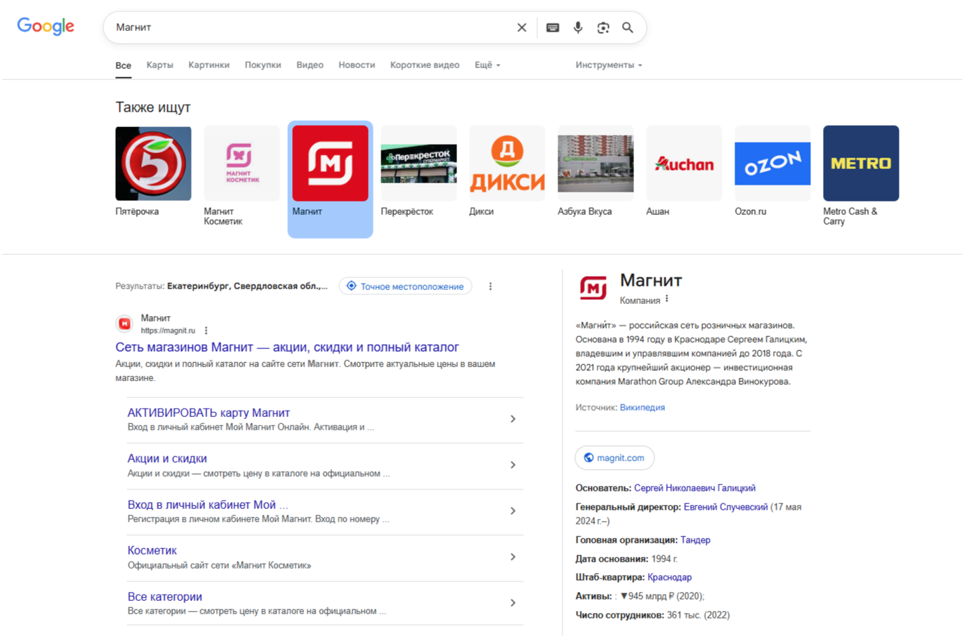 Ответ Google на запрос «Магнит» с дополнительными параметрами, в выдаче информация про ритейлерскую сеть