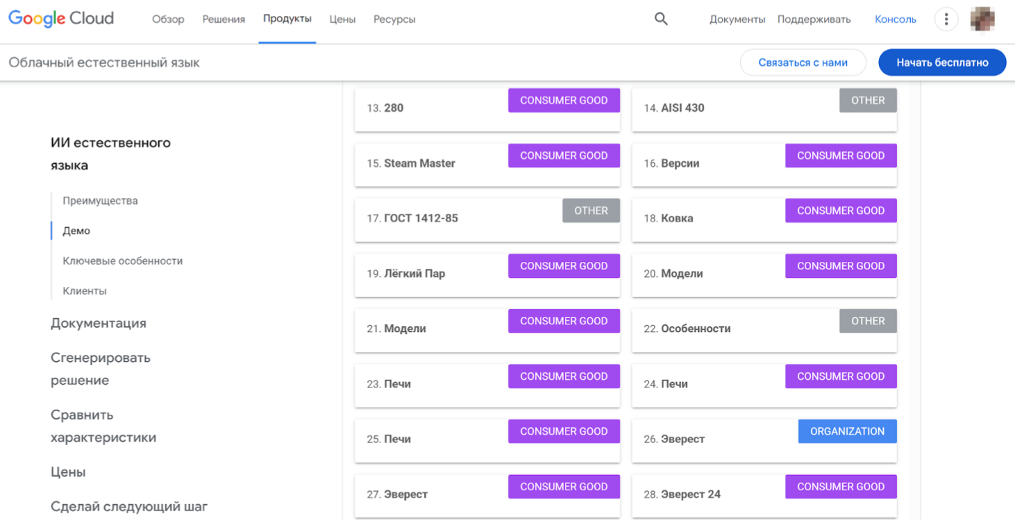 Пример анализа текста о бренде печей для бань в сервисе Google Cloud Natural Language API