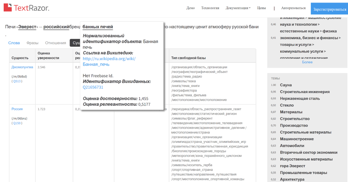 Сервис поддерживает несколько языков, включая русский. Можно пользоваться демо-режимом внизу страницы, когда нужно проанализировать готовый текст и понять, какие сущности в нём упоминаются, а также оценить их роль в контексте.