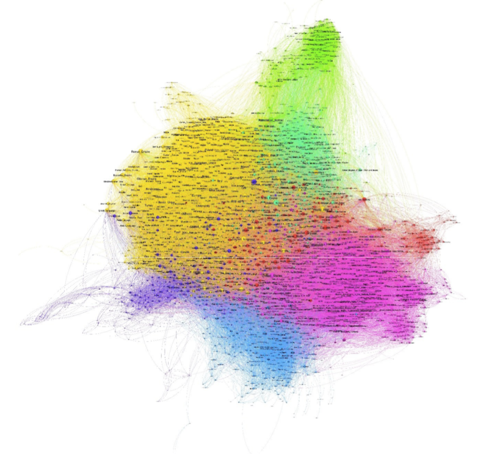 Схематично карта сущностей выглядит как система объектов, связанных логическими взаимосвязями. Подобный принцип используют в LLM, Big Data, фармацевтике, финтехе. Для понимания масштаба вот пример визуализации графа связей Википедии:
