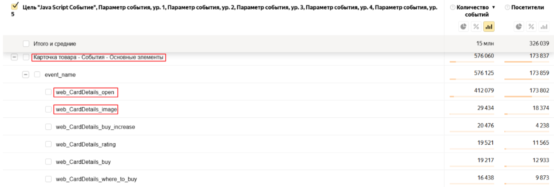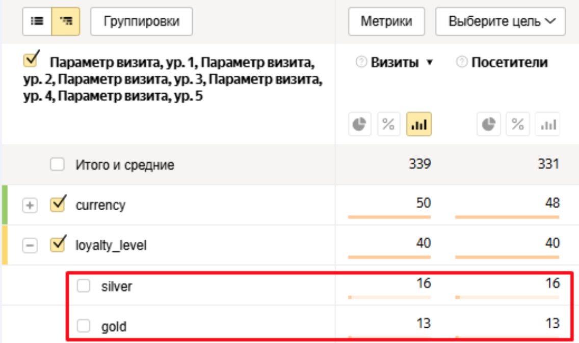 По умолчанию в отчёте данные сгруппированы по названию соответствующей Javascript-цели. Также как и в отчёте «Параметры событи», можно группировать параметры по уровням вложенности. Доступные метрики в этих отчётах полностью идентичны.