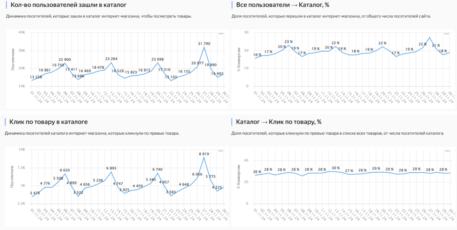 Используя эти новые показатели, можем вывести на дашборде наглядные чарты для мониторинга посещаемости каталога и частоты кликов по товарам:
