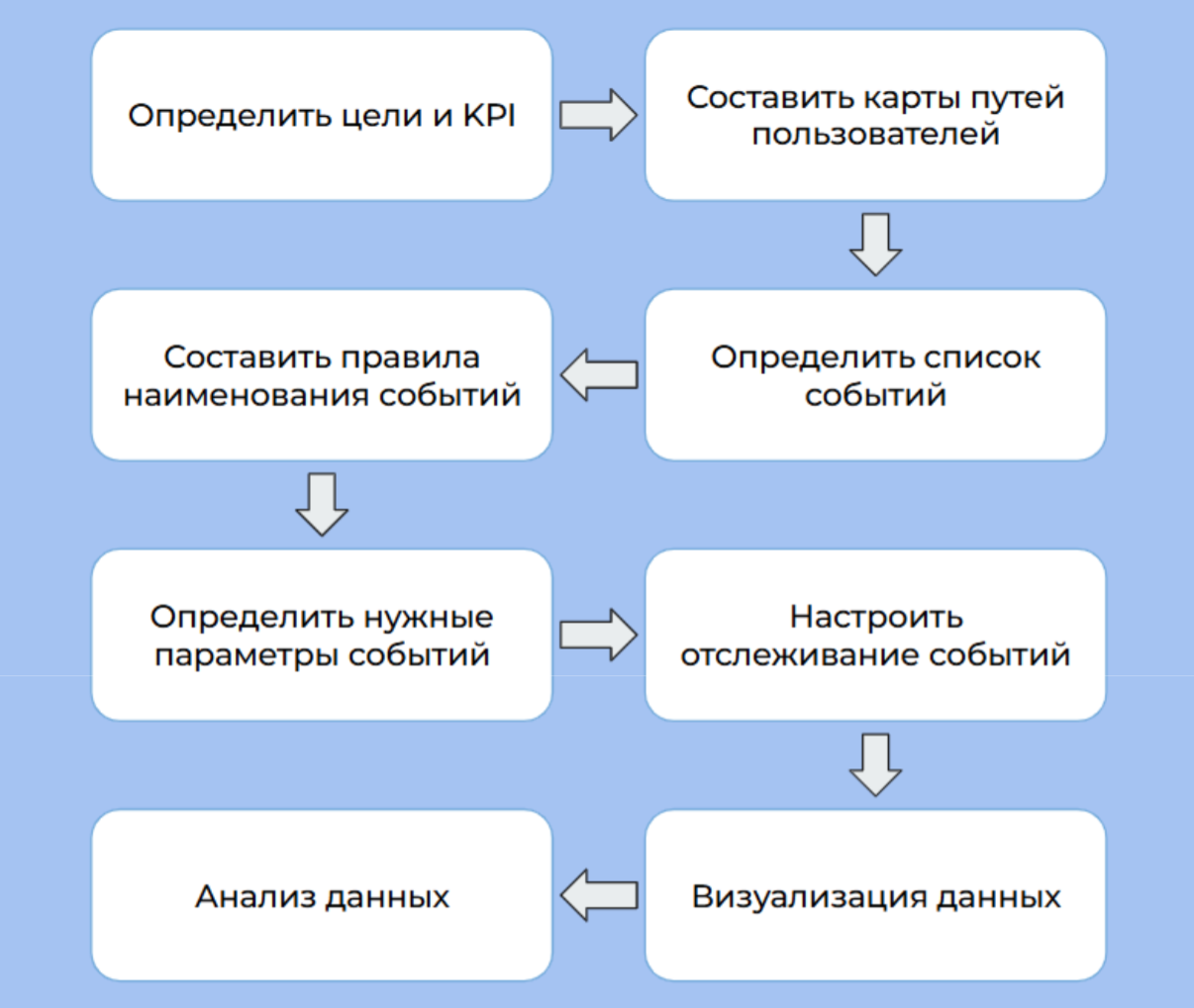 Определить цели и KPI | Определите, для достижения каких целей необходима настройка событий: увеличение конверсий, повышение вовлечённости, тестирование нового функционала или удержание клиентов, знание как взаимодействуют пользователи на определенном этапе воронки на сайте. |