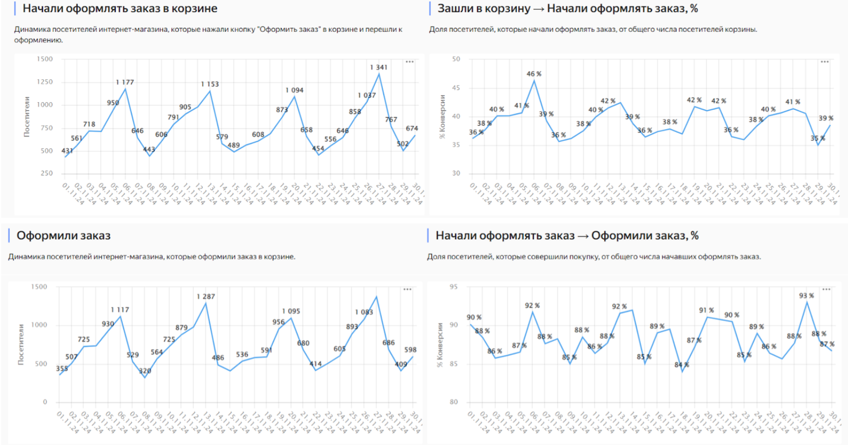 На этапе оформления заказа отслеживаются следующие действия: «Переход в корзину», «Начало оформления заказа», «Заказ оформлен».