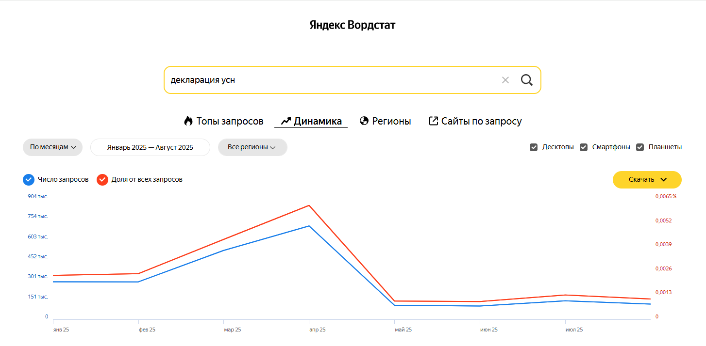 Всплеск запросов в апреле, так как декларация УСН за 2024 сдавалась до 25 апреля, к чему мы и подвязали событийный контент