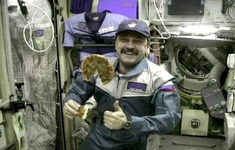 Российский космонавт Юрий Усачёв дегустирует пиццу Pizza Hut в космосе