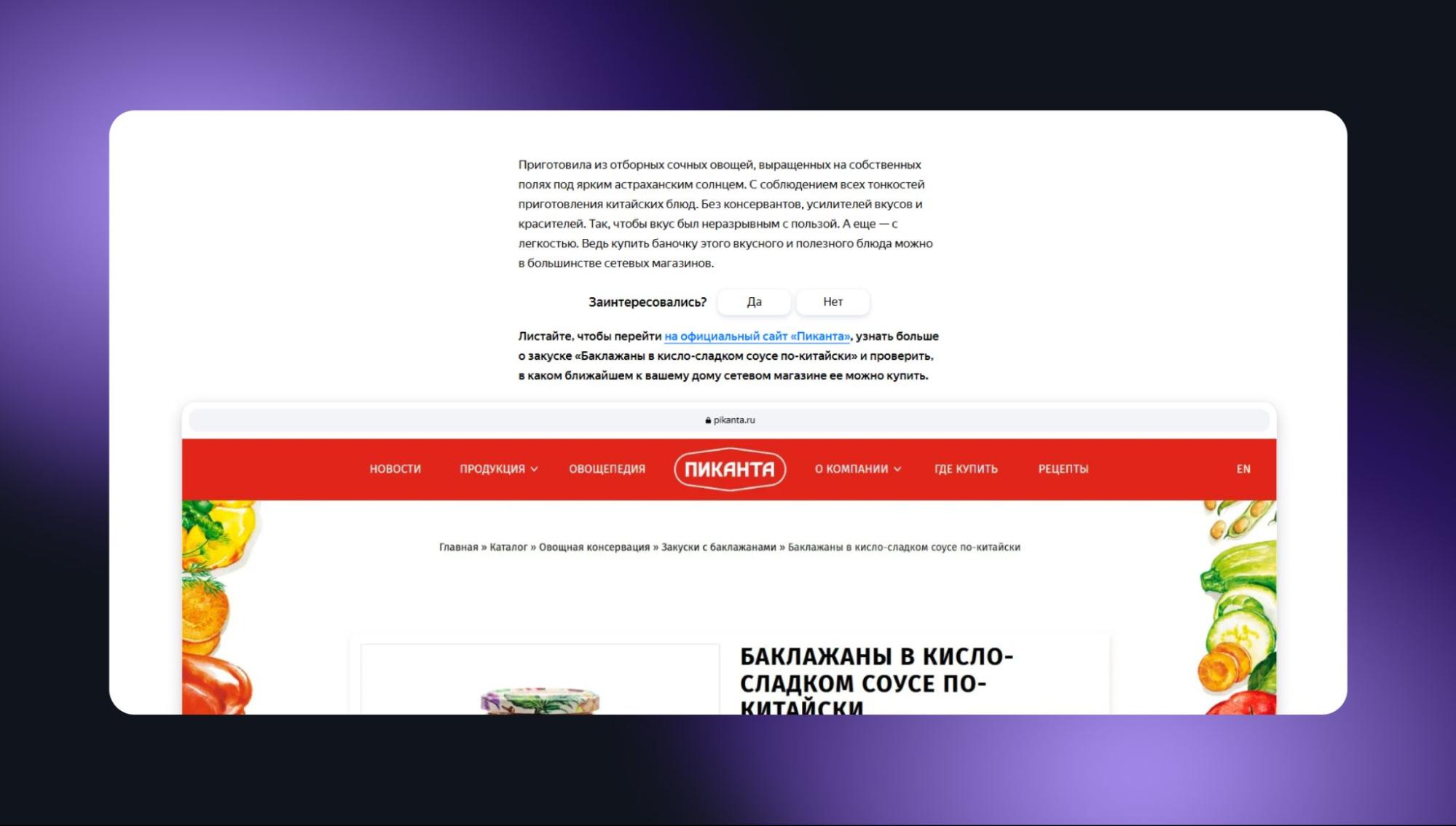 Рост интереса к бренду: специальное исследование Яндекса (Search Lift) показало, что пользователи, которые читали наши статьи, на 16,6% чаще начинали искать продукцию «Пиканта» в поиске. Контент напрямую стимулировал интерес к бренду.