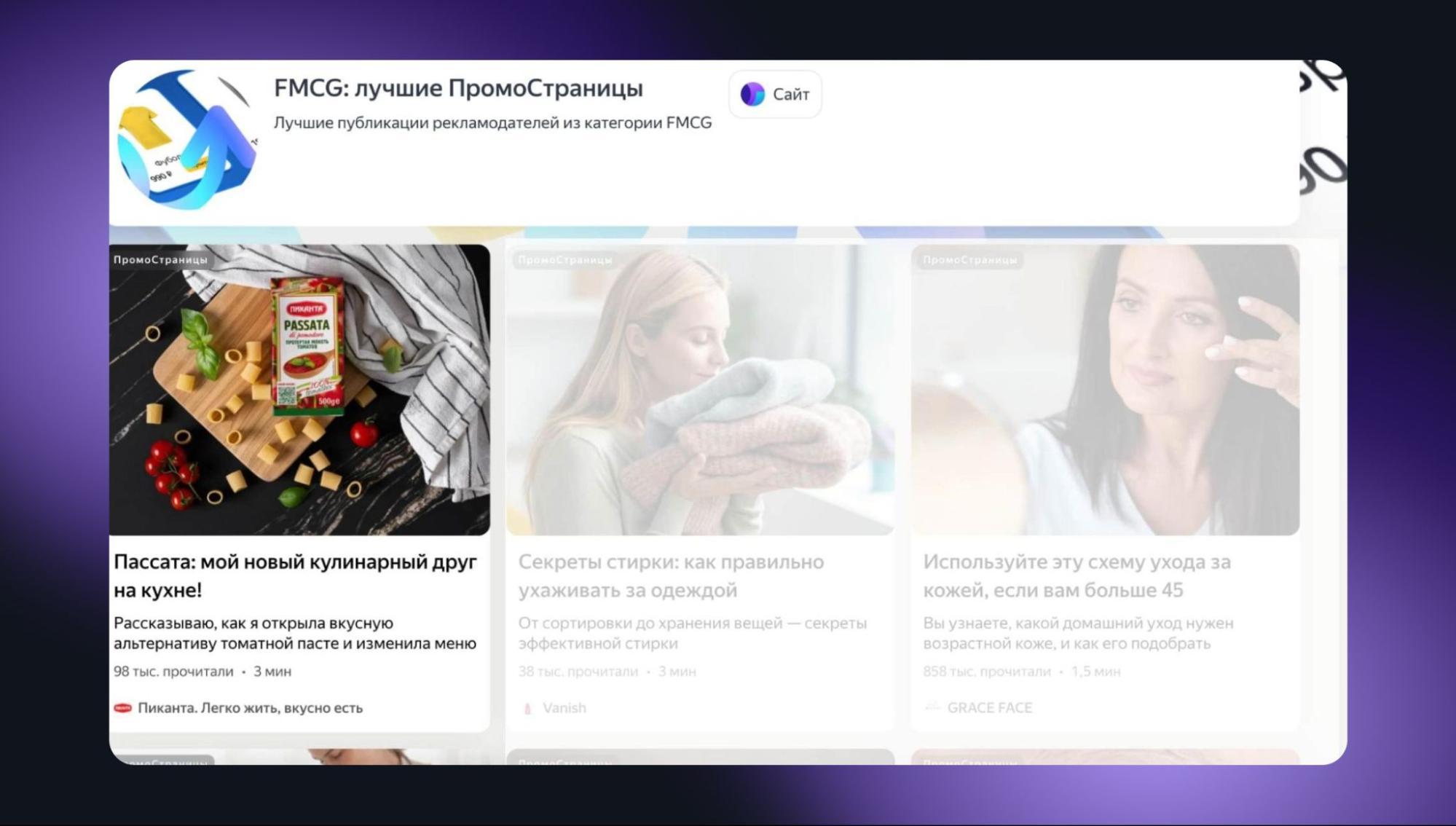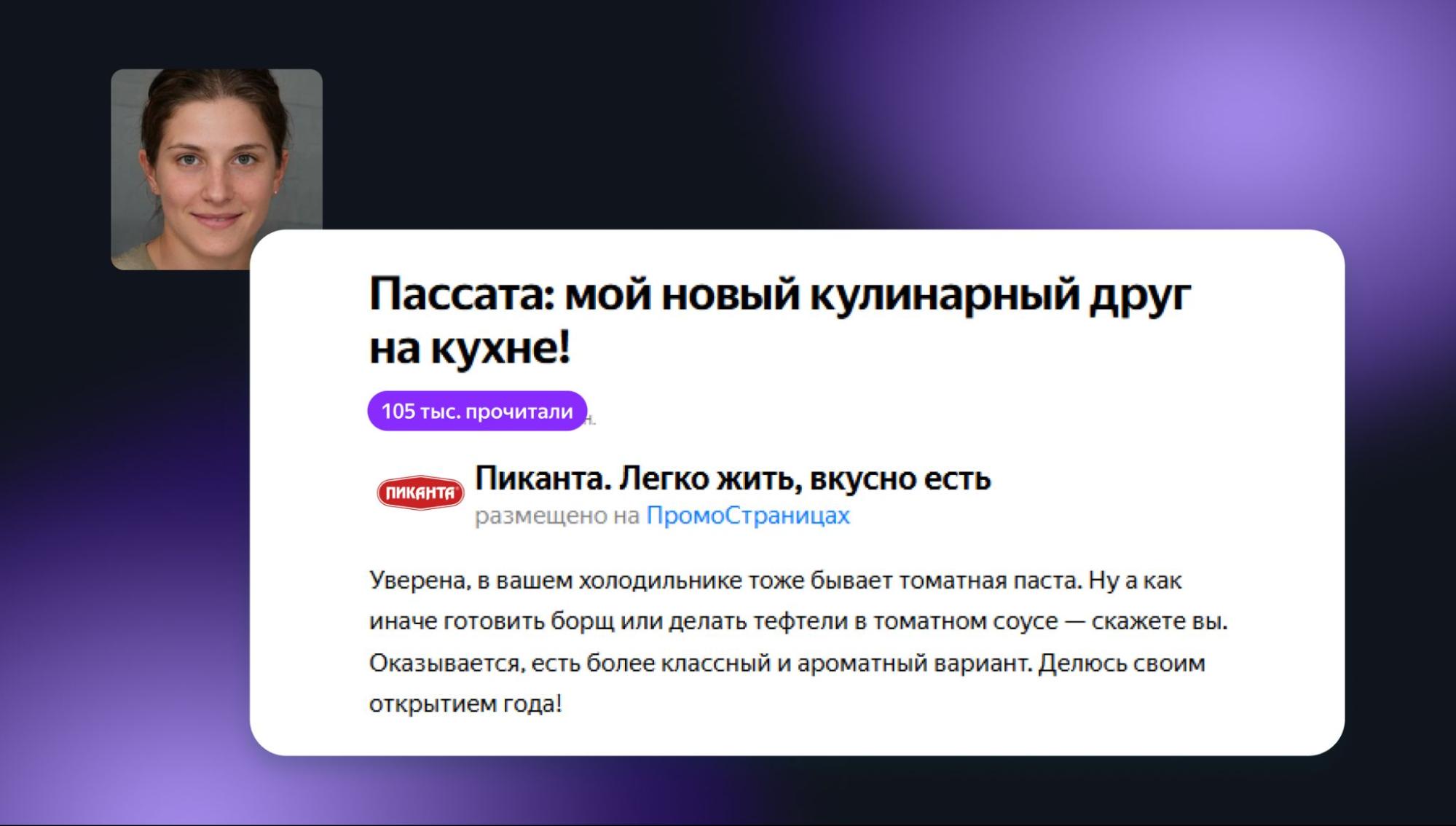 Здесь мы миксовали сразу 3 подхода: касались истории продукта, показывали сценарии его использования и говорили про пользу для здоровья. Например, как в статье «Пассата: мой новый кулинарный друг на кухне!». Добавили личного опыта и экспрессии через нативную историю от первого лица и получили локомотивную статью, которая попала на первое место в ленте лучших материалов ПромоСтраниц Яндекса в категории FMCG.