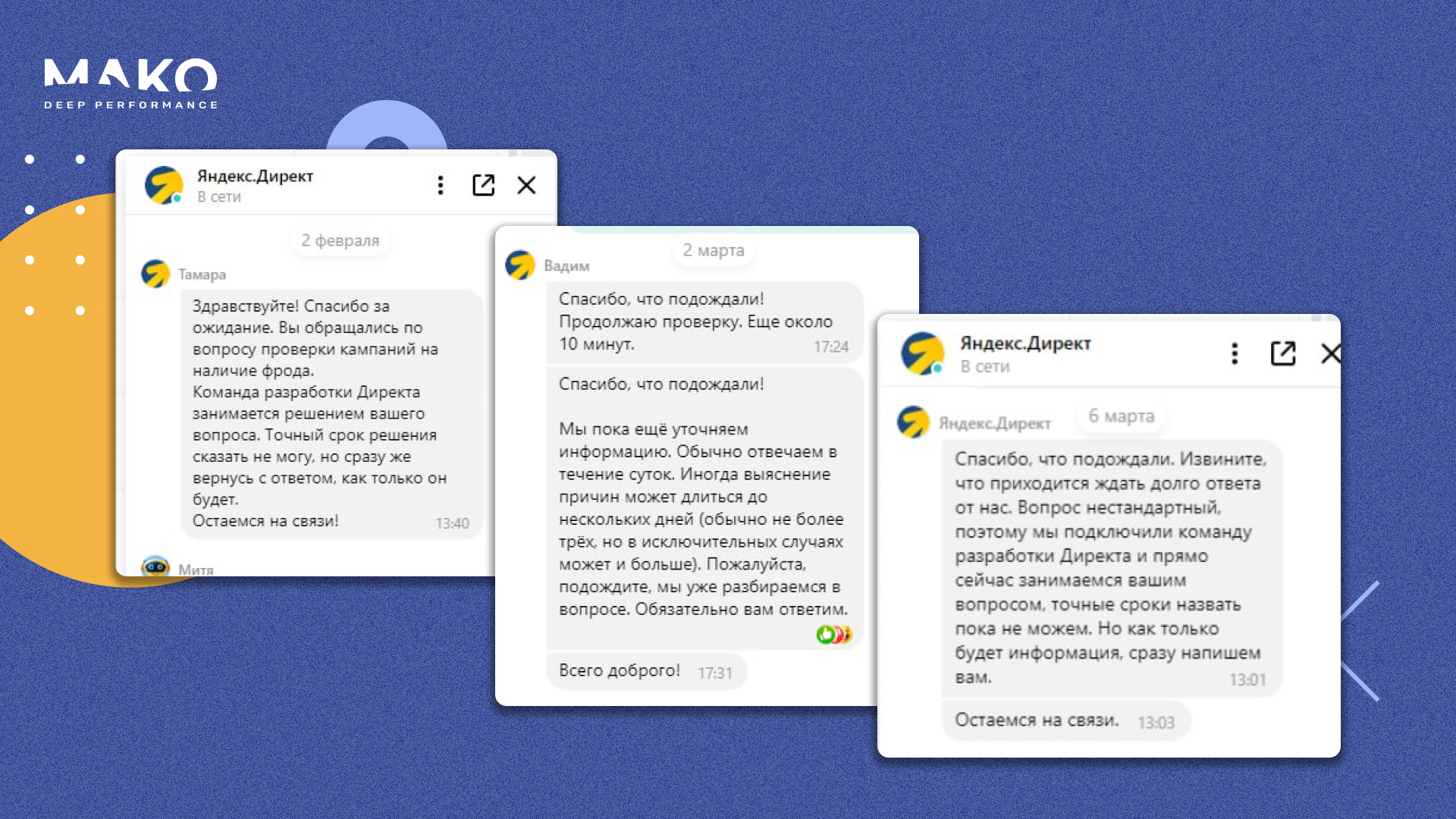 Утром 31 января мы направили детальное обращение в поддержку Яндекс Директа с описанием проблемы. Приложили все доказательства, объяснили, что кампания атакована фродом, и запросили разбирательство и возврат средств.