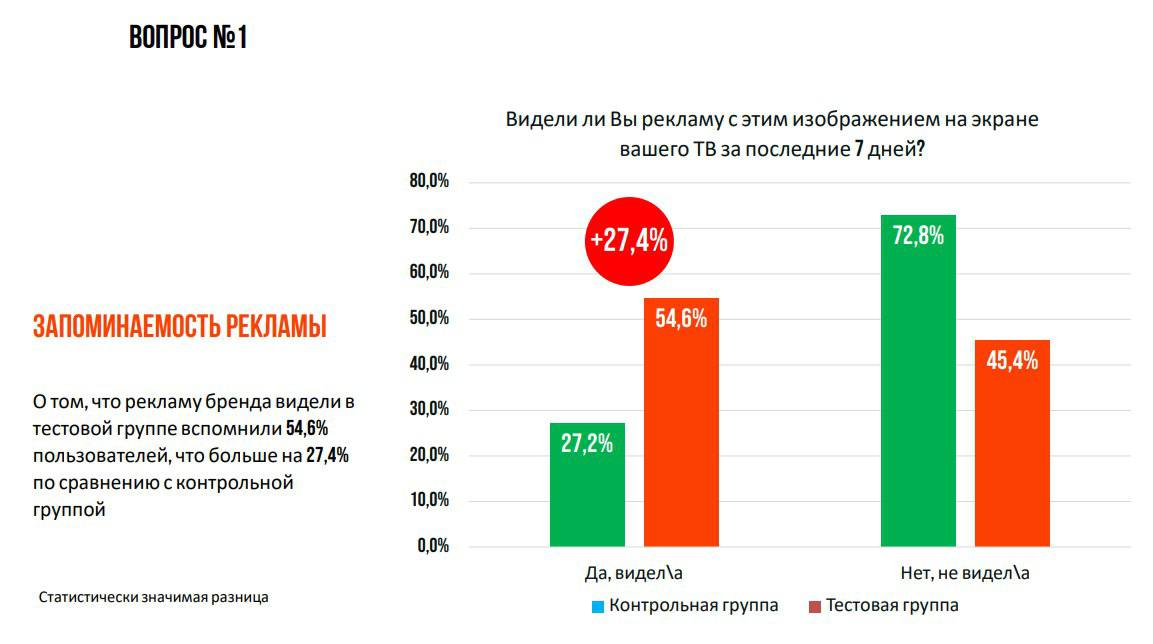 Запоминаемость показа рекламы. 54,6% пользователей тестовой группы вспомнили, что видели рекламу — это на +27,4% больше, чем в контрольной группе.