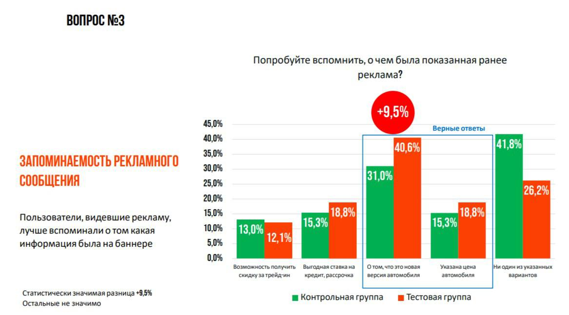трейд-ин , ставка, цена). +9,5% — респонденты тестовой группы чаще указывали, что помнят детали предложения.