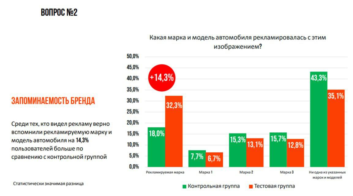 - Запоминаемость бренда и модели автомобиля. Точное воспоминание марки и модели продемонстрировали на 14,3% чаще, чем в контрольной группе.