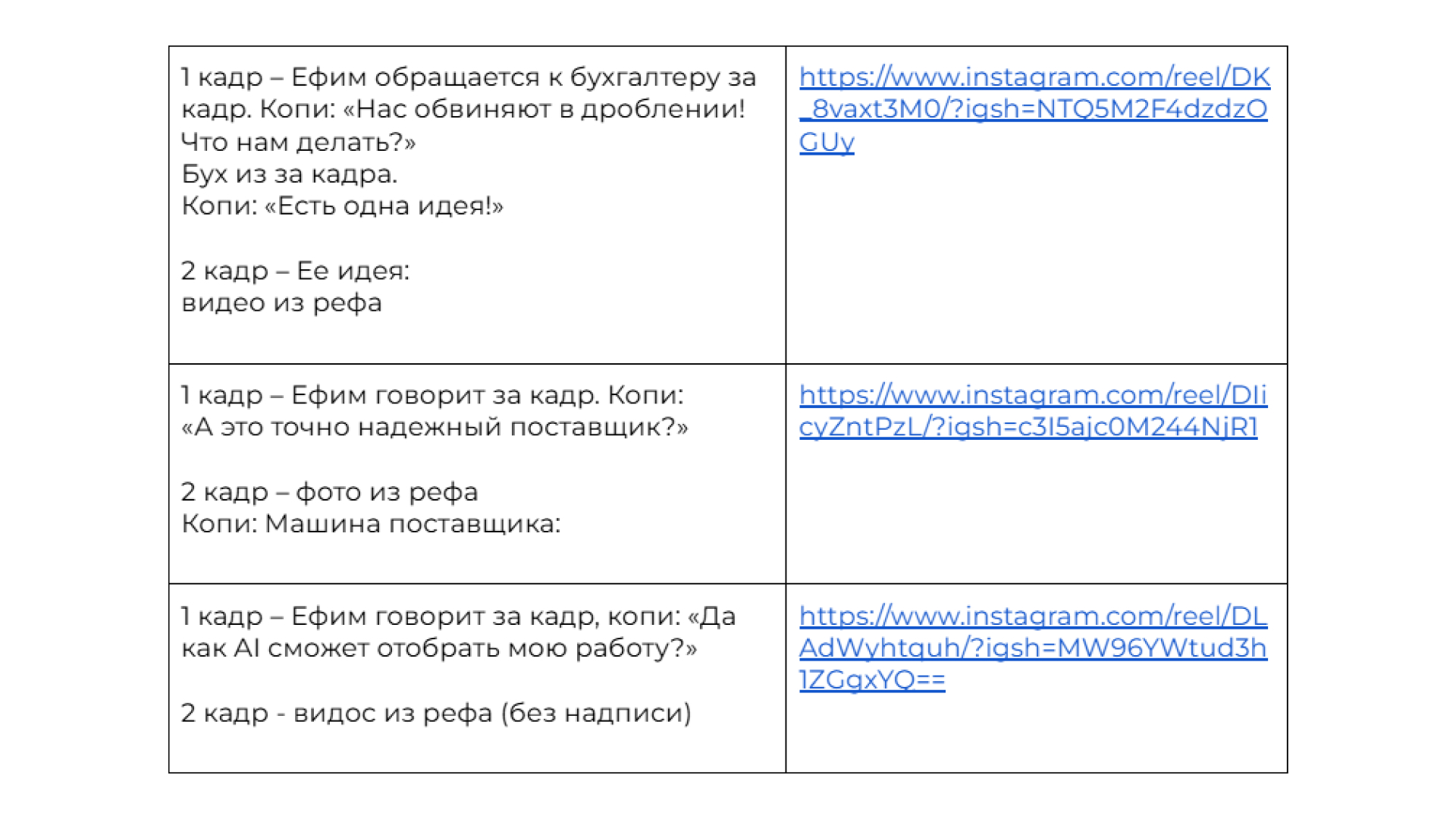 Так выглядел сценарий на съёмочный день. Слева — ТЗ для съёмки, справа — ссылки на референсы. Референсы могут быть совсем не по предпринимательской тематике, но из них можно переиспользовать сам формат шутки