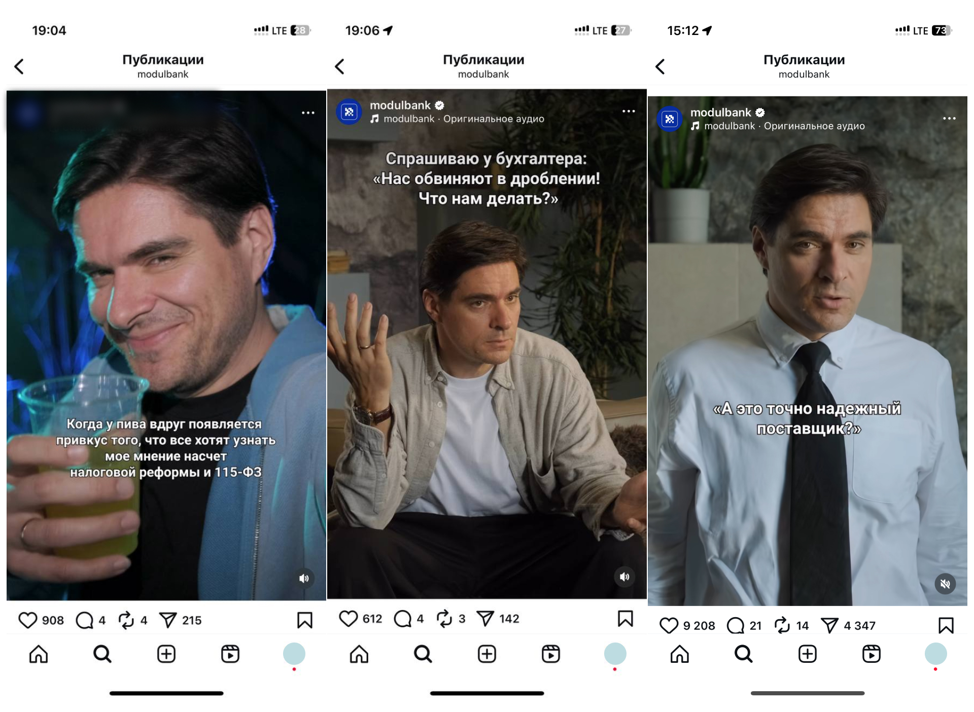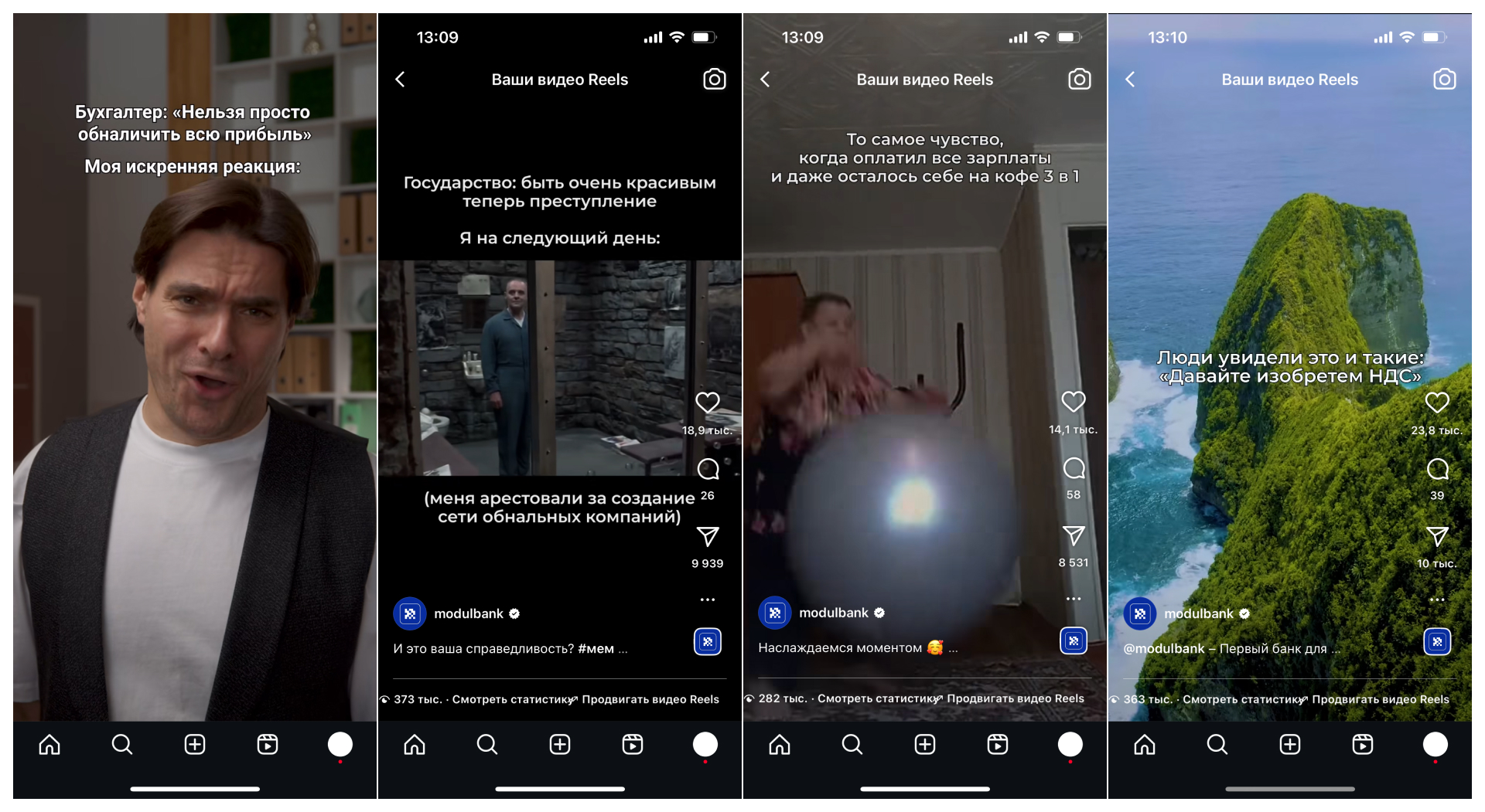 В 2024 году мы начали снимать первые смелые рилсы для Модульбанка, часто на грани фола и с чёрным юмором. Раньше в соцсетях банка были только посты о продуктах и образовательная база для предпринимателей, но наши ролики вывели коммуникацию на новый уровень. Они так завирусились, что, скорее всего, вы тоже их видели. Стало понятно: понимание их болей нужно предпринимателям гораздо больше, чем полезный контент.
