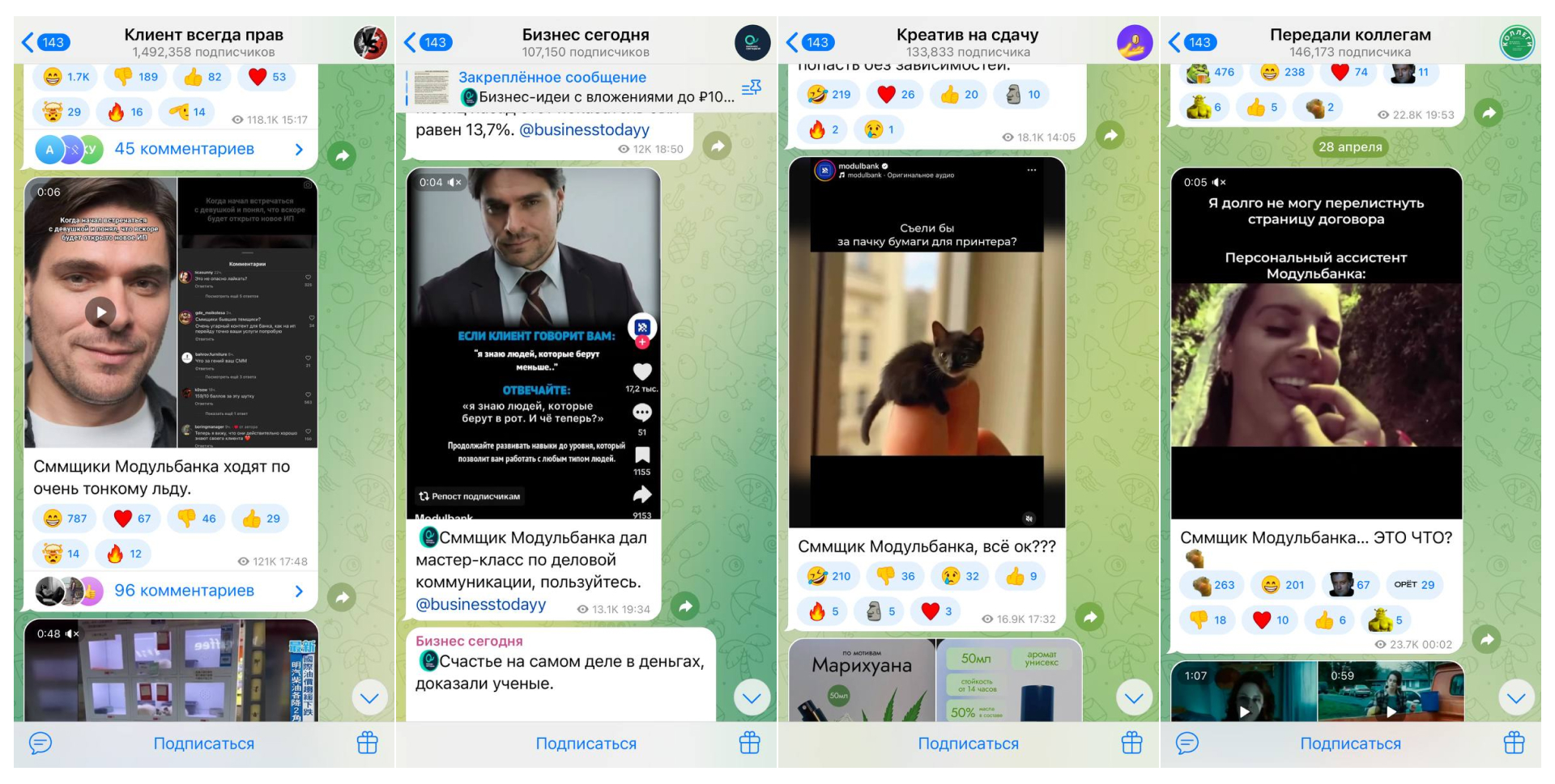 Моноформат влияет и на узнаваемость банка: человек видит ролик и вспоминает, что это за контент. Он уже ожидает, что в канале Модульбанка получит минутку отдыха и увидит классный прикол, поэтому ему заранее становится смешно. Это мощнейшее конкурентное преимущество.