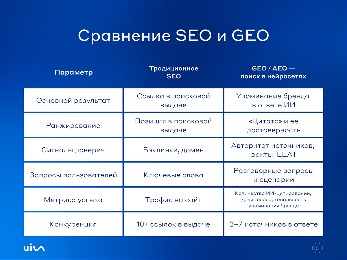 Это не просто тренд — это смена парадигмы. Если раньше ключевым фактором присутствия компании в онлайн-пространстве была выдача поисковых систем (SEO), то теперь критически важно, чтобы бренд упоминался в нейроответах. Именно эти ответы становятся для пользователя «новой первой страницей интернета».