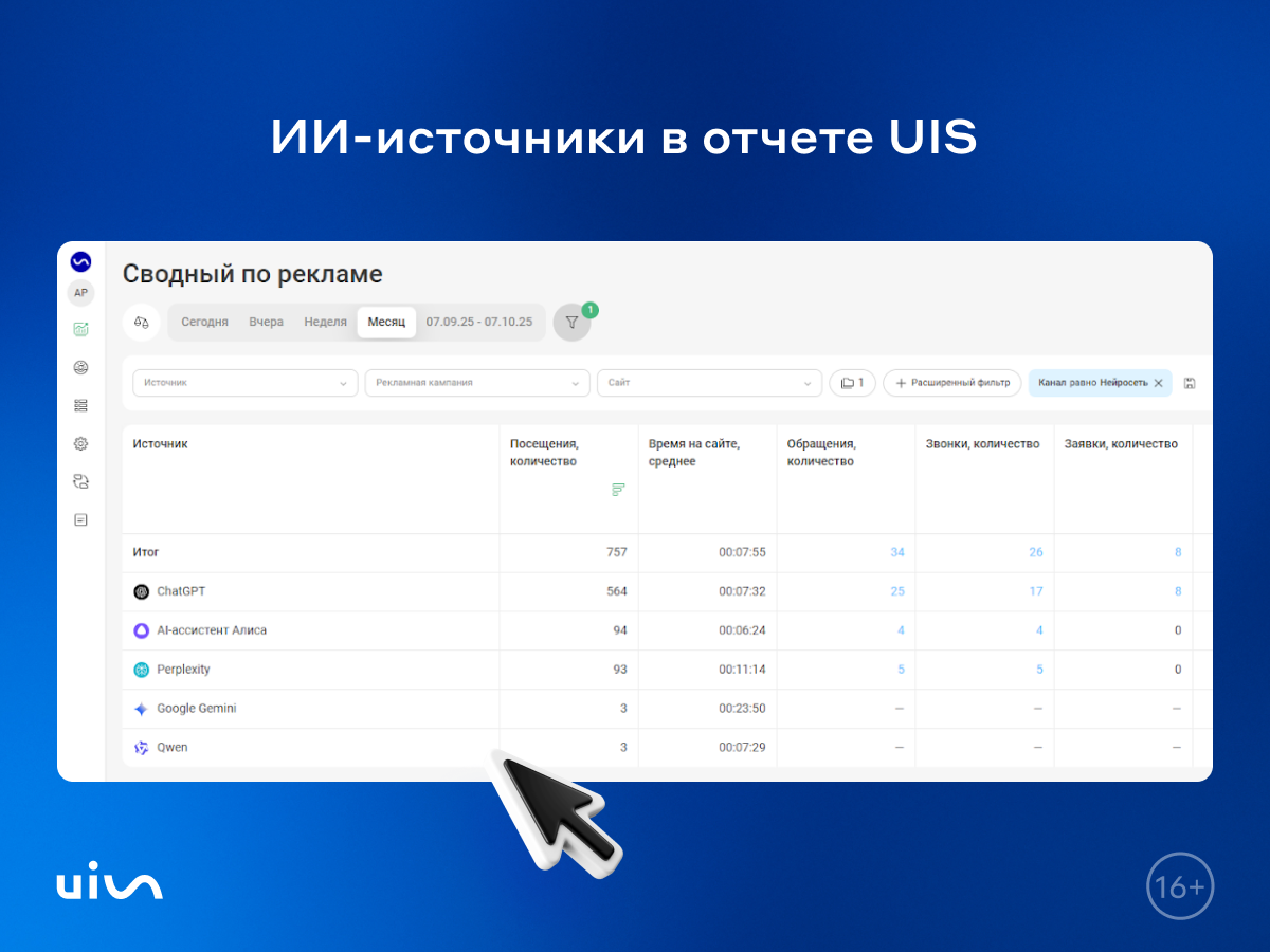 Система UIS идёт в ногу со временем: определяет переходы из нейросетей и создаёт под них системные источники. Теперь аналитика рекламы UIS чётко покажет, что обращение в компанию поступило именно из ответов нейросетей.