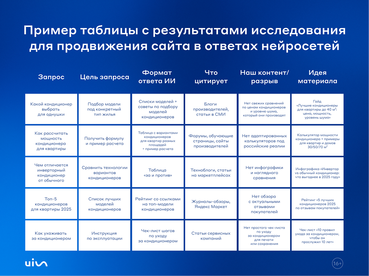 Результат: таблица с итогами исследования форм запросов и типов контента, который нейросеть выбирает для ответов.