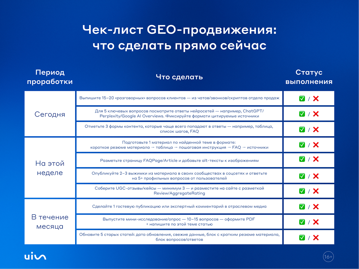 Структурируйте контент. Используйте списки, таблицы, чек-листы и блоки «Вопрос-ответ» (FAQ): ИИ берёт из них готовые фрагменты.